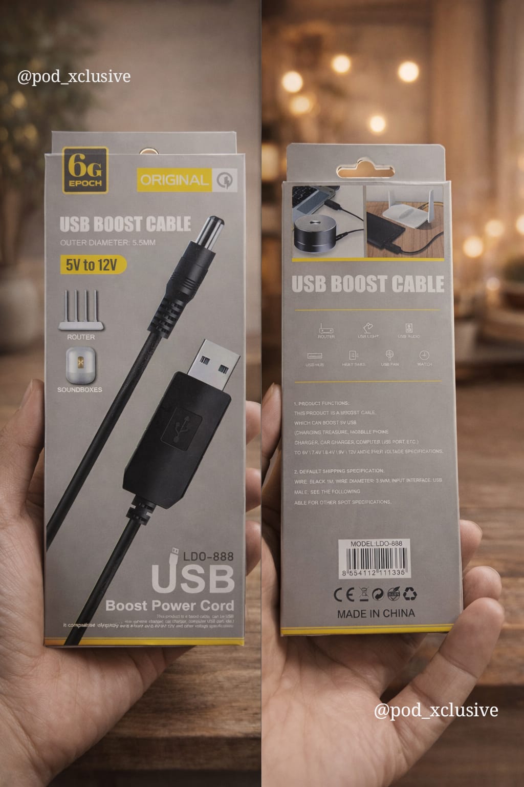 The Epoch 6G USB Boost Power Cord (Model LDO-888) is a versatile cable that converts a standard 5V USB input into a 12V DC output, allowing you to power 12V devices such as Wi-Fi routers, soundboxes, and small electronics using a USB power source like a laptop or power bank.